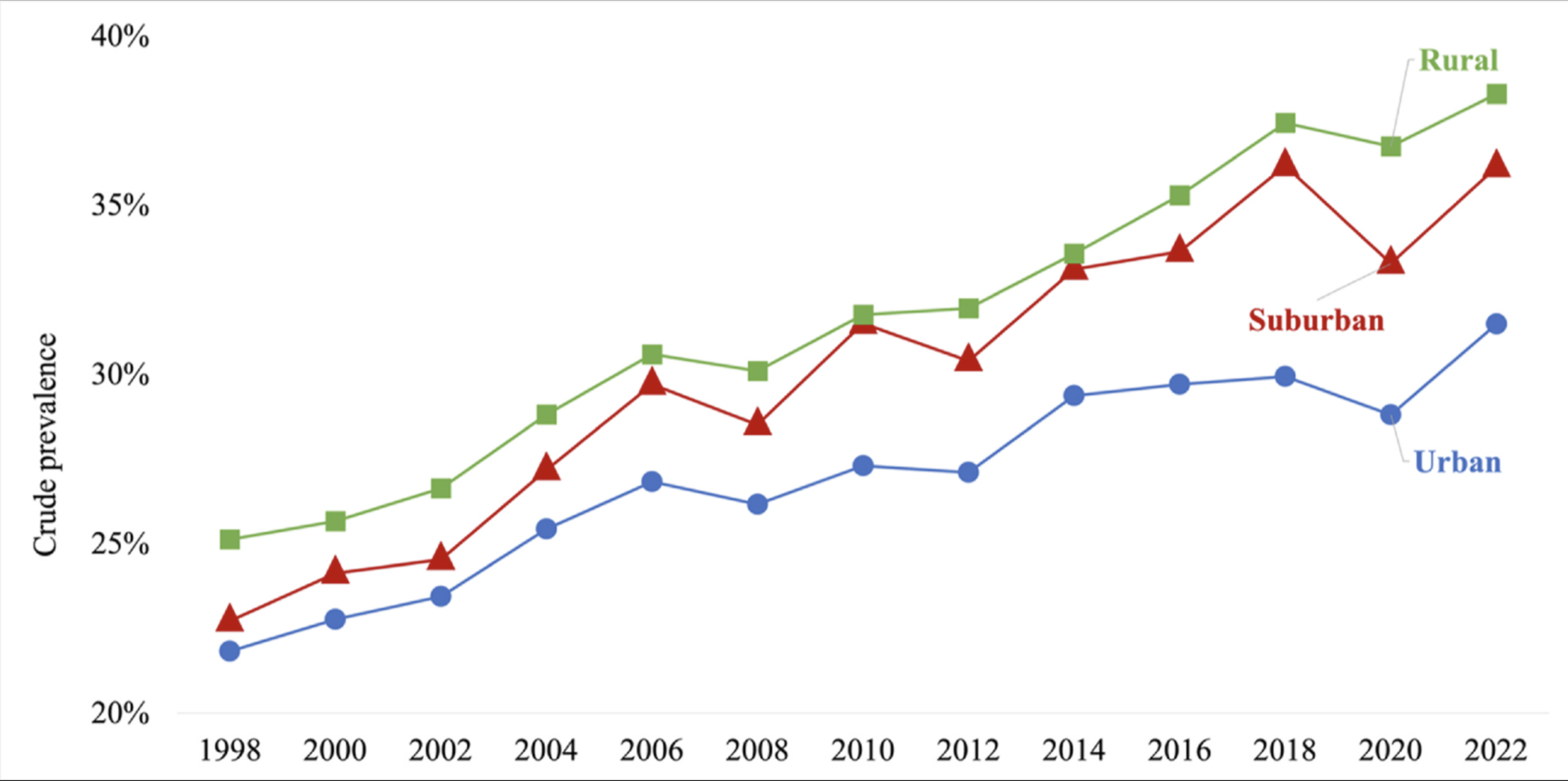 Chronic pain prevalence and trends in urban, suburban, and rural areas among American adults aged 55+, 1998-2022